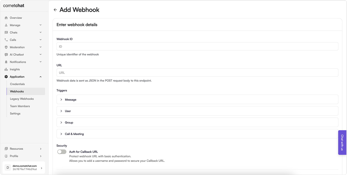 • Webhooks faciliate real-time event-driven communication with your system, enabling you to receive HTTP POST requests from CometChat that carry details about different events.