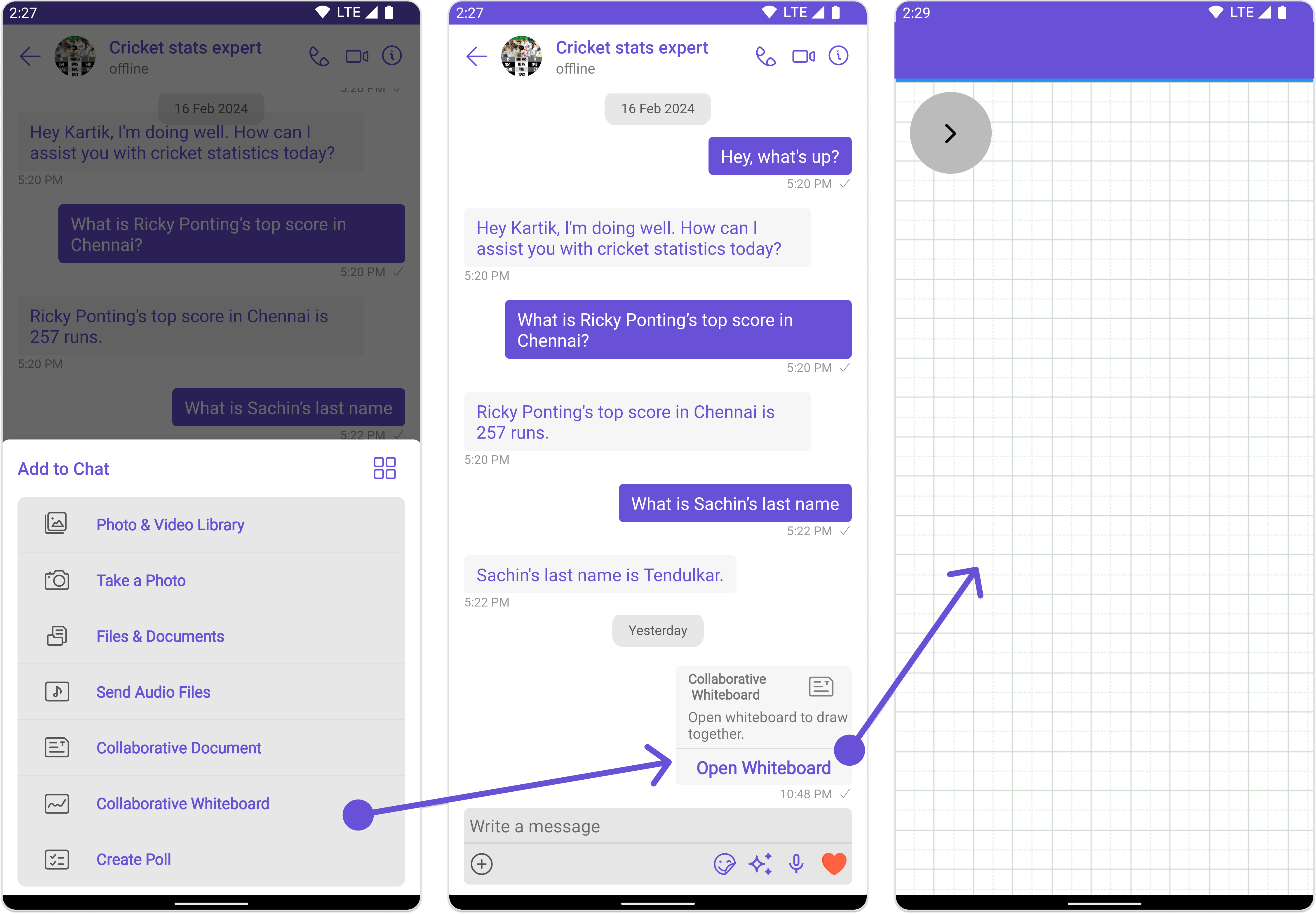 The Collaborative Whiteboard extension facilitates real-time collaboration. Users can draw, brainstorm, and share ideas on a shared digital whiteboard. For a comprehensive understanding and guide on implementing and using the Collaborative Whiteboard Extension, refer to our specific guide on the Collaborative Whiteboard Extension. Once you have successfully activated the Collaborative Whiteboard Extension from your CometChat Dashboard, the feature will automatically be incorporated into the Action Sheet of the Message Composer component of UI Kits.