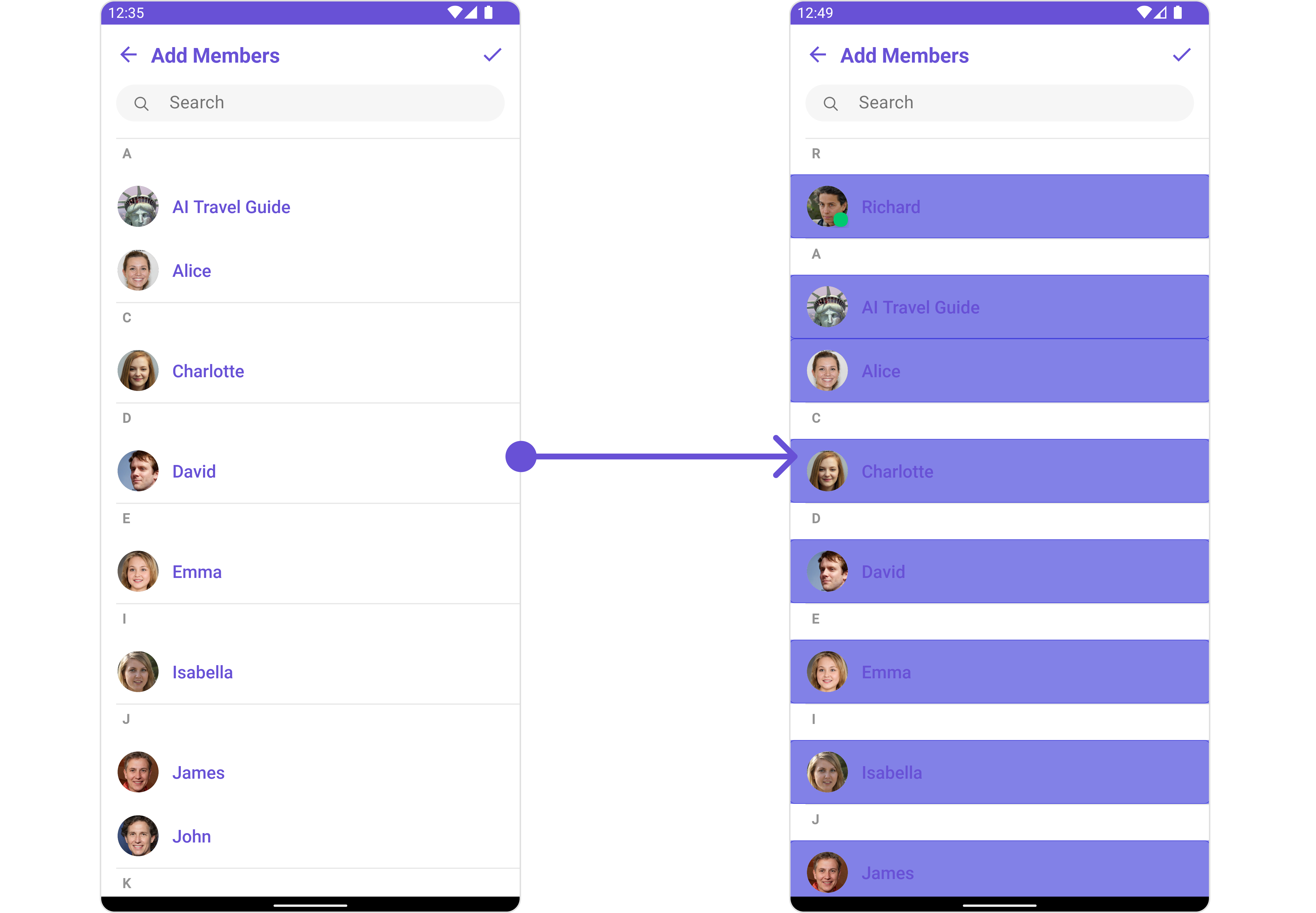 For advanced-level customization, you can set custom views to the component. This lets you tailor each aspect of the component to fit your exact needs and application aesthetics. You can create and define your own views, layouts, and UI elements and then incorporate those into the component. TheAdd Members component does not provide additional functionalities beyond this level of customization.