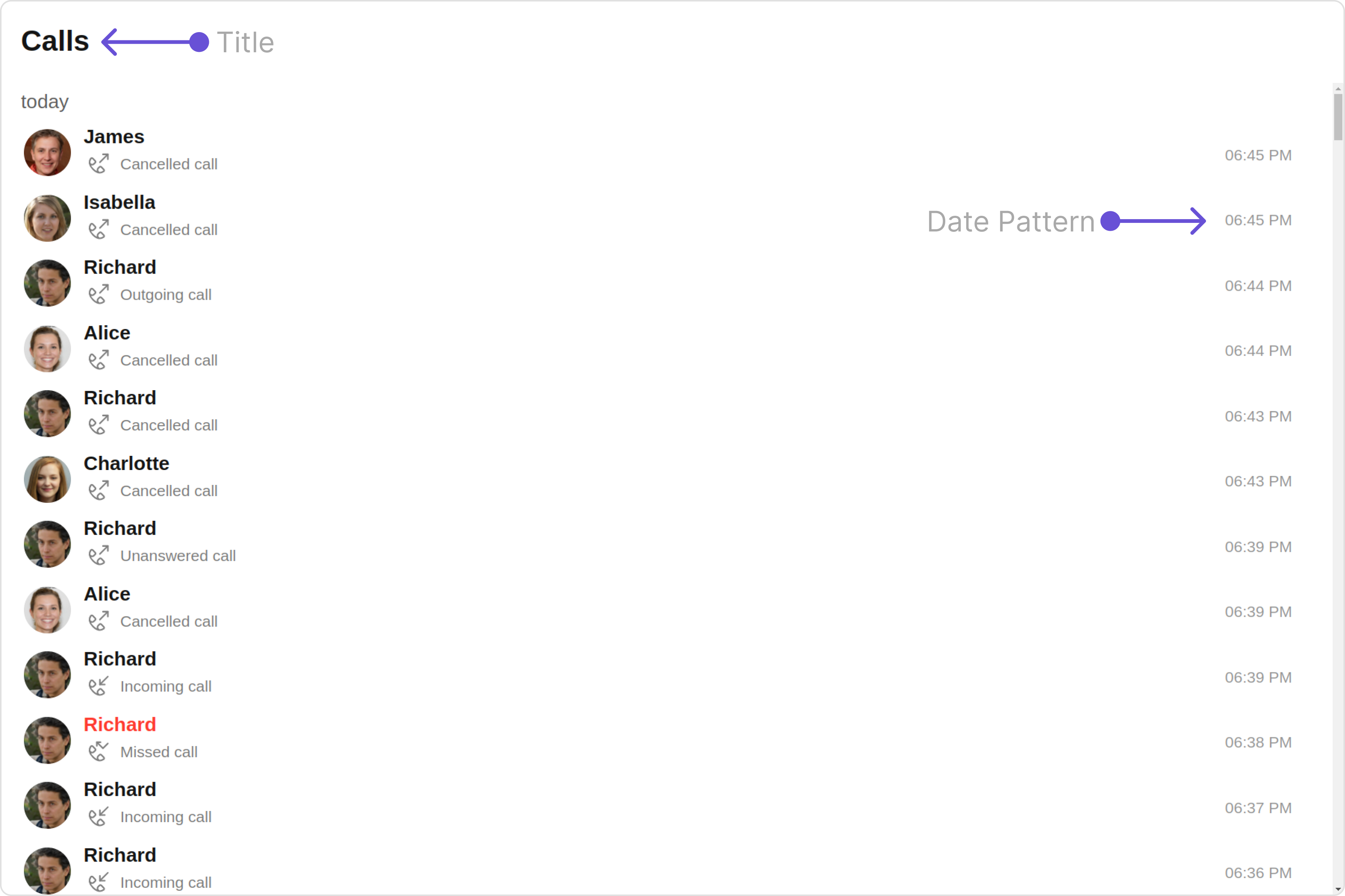 To fit your app’s design requirements, you can customize the appearance of the Call Logs component. We provide exposed methods that allow you to modify the experience and behavior according to your specific needs.Style