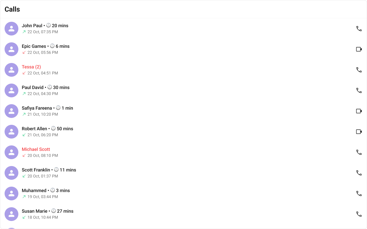 You can customize the trailing view for each call logs item to meet your requirements. Shown below is the default chat interface.